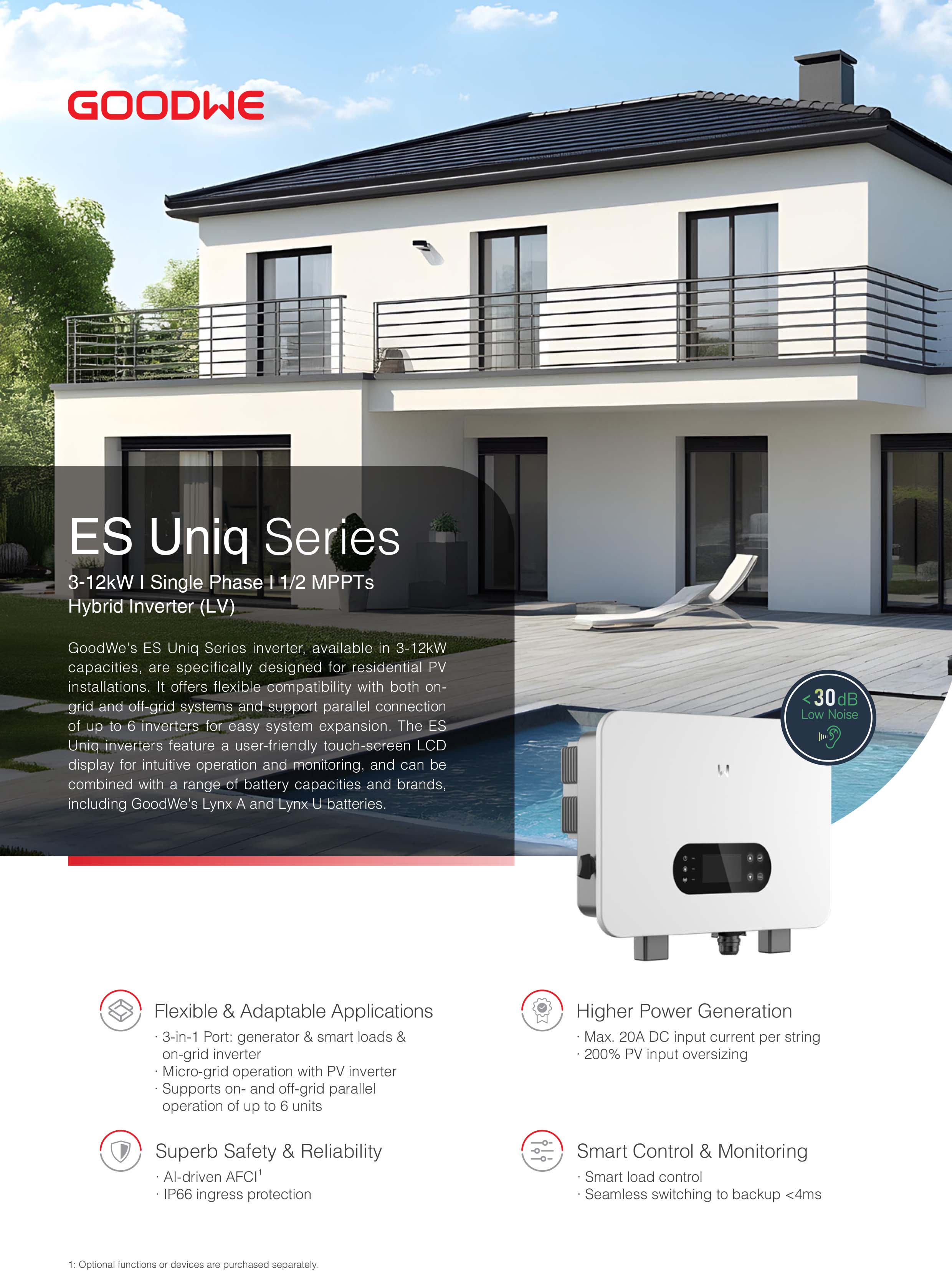 Sản phẩm được trang bị màn hình LCD cảm ứng thân thiện, hỗ trợ kết nối song song tối đa 6 biến tần để mở rộng công suất. Khả năng tương thích linh hoạt với nhiều loại pin Lithium, bao gồm pin Lynx A và Lynx U của GoodWe.