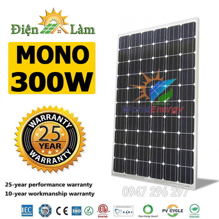 Tấm pin năng lượng mặt trời Mono 300W WorldEnergy (Solar panels) đáp ứng tiêu chuẩn chất lượng nghiêm ngặt của IEC, UL, CE, TUV , ETL, PV Cycle, MCS, BBA, Safety class II. Bảo hành hiệu suất 25 năm để đảm bảo hiệu suất tối đa cho hiệu quả hệ thống cao nhất.