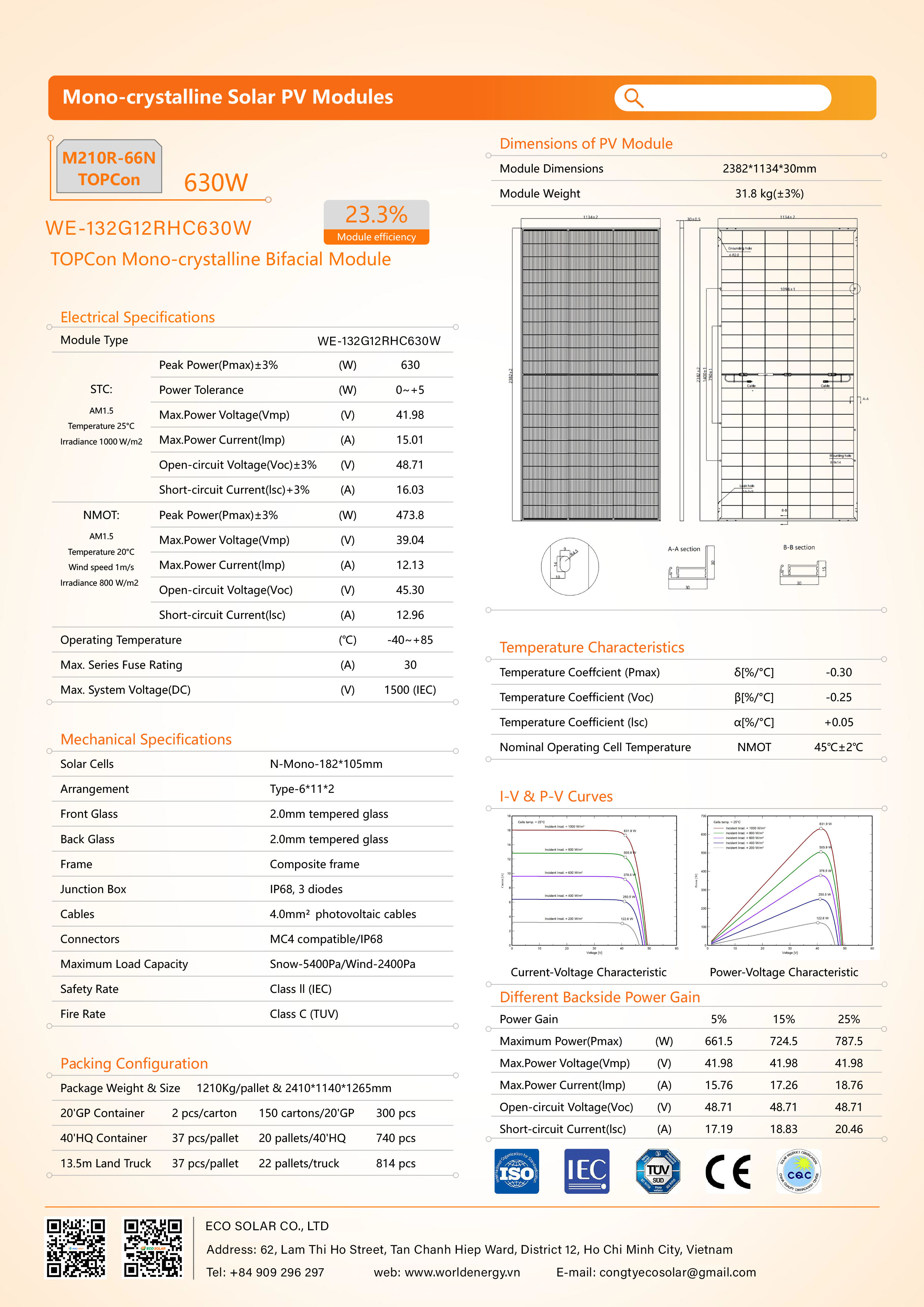 Tấm Pin Năng Lượng Mặt Trời Hai Mặt Kính WORD ENERGY 630W là giải pháp tối ưu với công nghệ hấp thụ ánh sáng từ cả hai mặt, nâng cao hiệu suất đến 30% so với pin đơn mặt. Được thiết kế với kính cường lực bền bỉ, sản phẩm chịu lực tốt, chống chịu mọi điều kiện thời tiết khắc nghiệt. Với hiệu suất chuyển đổi cao và tuổi thọ dài lâu, đây là lựa chọn lý tưởng cho các công trình từ dân dụng đến công nghiệp, mang lại giải pháp tiết kiệm và bền vững cho người dùng.