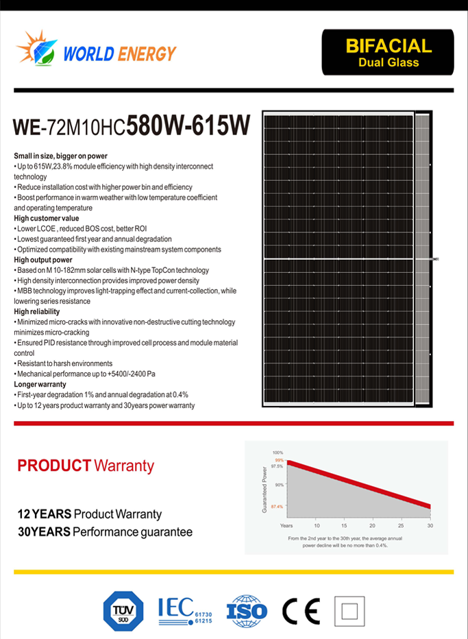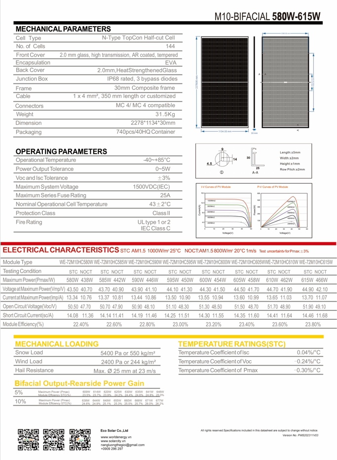Tấm pin năng lượng mặt trời World Energy WE-72M10HC595W là dòng sản phẩm cao cấp với công suất lên đến 615W và hiệu suất chuyển đổi module ấn tượng đạt 23.8%. Nhờ ứng dụng công nghệ tiên tiến N-type TopCon cùng thiết kế liên kết mật độ cao, sản phẩm không chỉ tối ưu hóa hiệu suất mà còn giảm thiểu chi phí lắp đặt và tăng giá trị sử dụng lâu dài.